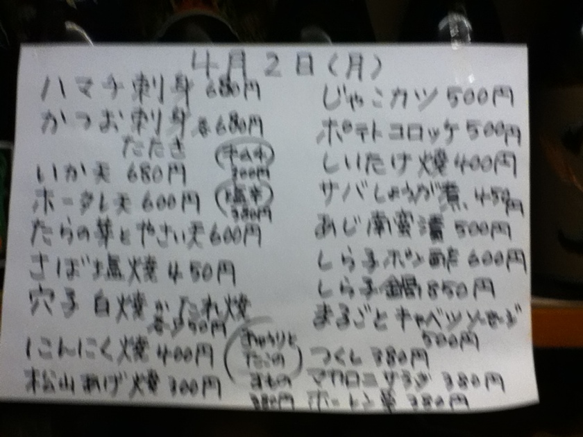 本日のおすすめメニュー 2012年04月02日 (月)<香代の店たんたん山>