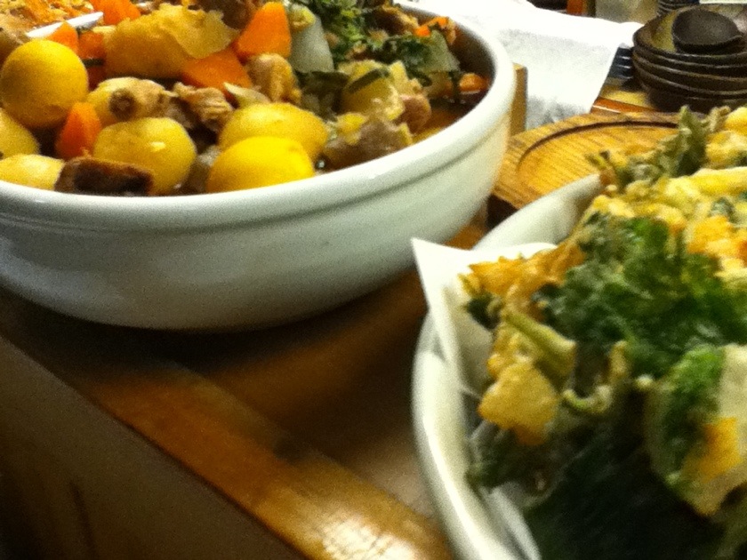玉ひもとじゃがいも煮物、山三つ葉と貝柱揚げ 2013年04月16日 (火)<香代の店たんたん山>