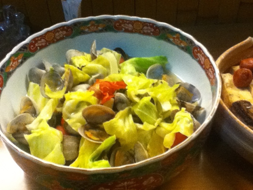アサリと春キャベツの白ワイン蒸し、ほーたれイワシ梅に 2014年02月27日 (木)<香代の店たんたん山>