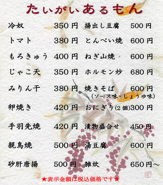 | ロック・水割り・ハイボール | ¥500 |